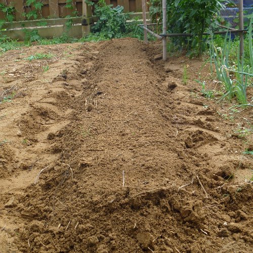 7月25日です。 地面の軟らかい所に蒔きます。 多少の雑草はかまわず 油かすを撒きます。 以前に苦土石灰は撒いてあります。 スコップで天地返しします。 なるべく深くします。 ウネを作ります 軟らかいので 今回はウネらしくなりました。 時無しです。 100均で2袋100円。